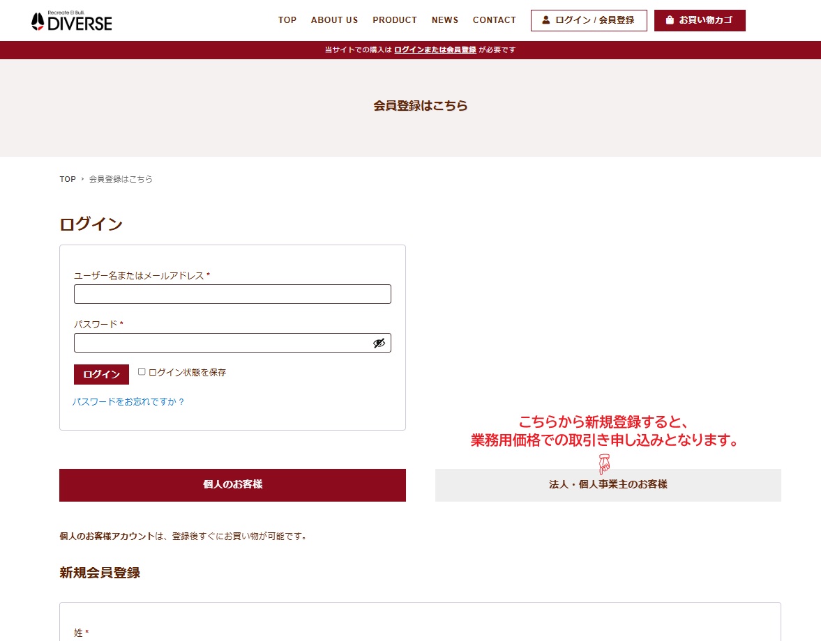 業務用卸価格(法人・個人事業主様向け)アカウントの登録について」よりご登録ください。